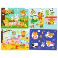 Paketissa on kaikki tarvittava: 4 paksua taustakuvaa (21 x 28 cm), 4 arkkia paksuja,kuvitettuja, valmiiksi leikattuja pahvipaloja, 1 tuubi liimaa, joka soveltuu alle 3-vuotiaille ja kuvallinen ohjevihko.