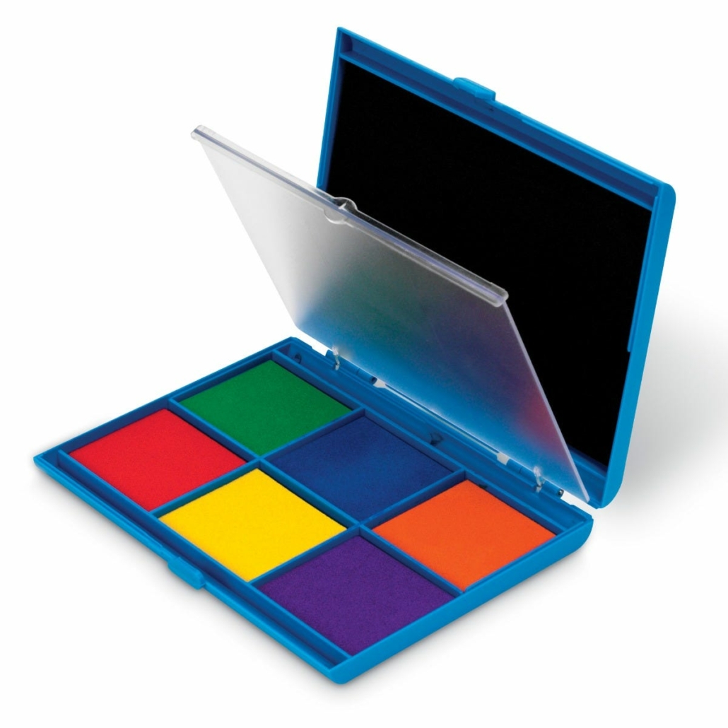 Rasia, jonka sisällä yhteensä seitsemän eriväristä leimasinmustetyynyä – toisella puolella iso musta tyyny ja toisella kuusi pienempää värikästä tyynyä. Muste voidaan pestä pois. Väreinä musta, vihreä, oranssi, keltainen, sininen, punainen ja violetti.