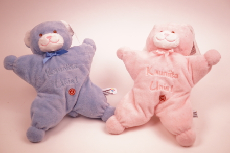 Vaalean sininen ja vaaleanpunainen soivapehmolelu. Soitto käynnistyy häntää vetämällä.